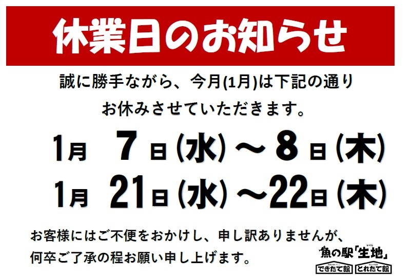 魚の駅「生地」今月のお休みのお知らせ